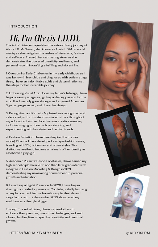 This book is about an Embark on an inspiring journey through visual arts, fashion, and self-care with Alexis L.D. McGowan, also known as Alyxis L.D.M on social media platforms. Born with a fierce determination and creative spirit, Alexis transformed early life challenges into a remarkable adventure, sharing her experiences as a lifestyle vlogger.
